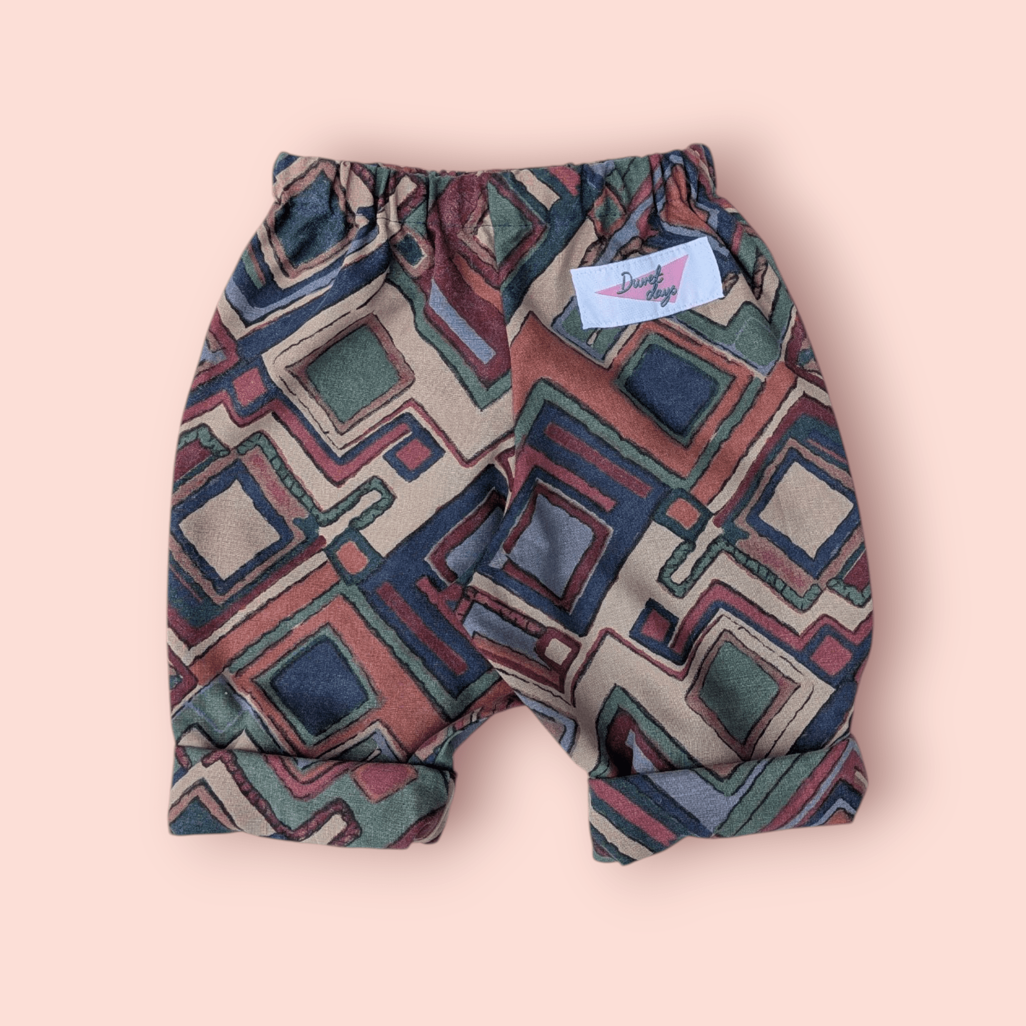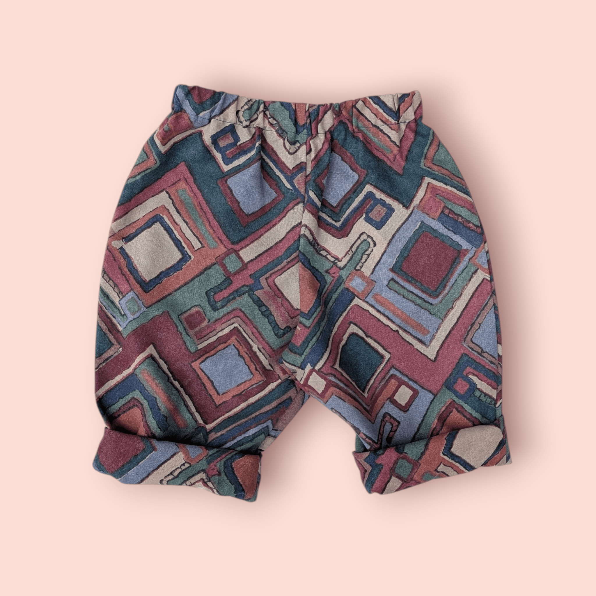 Upcycled vintage square print kids trousers.